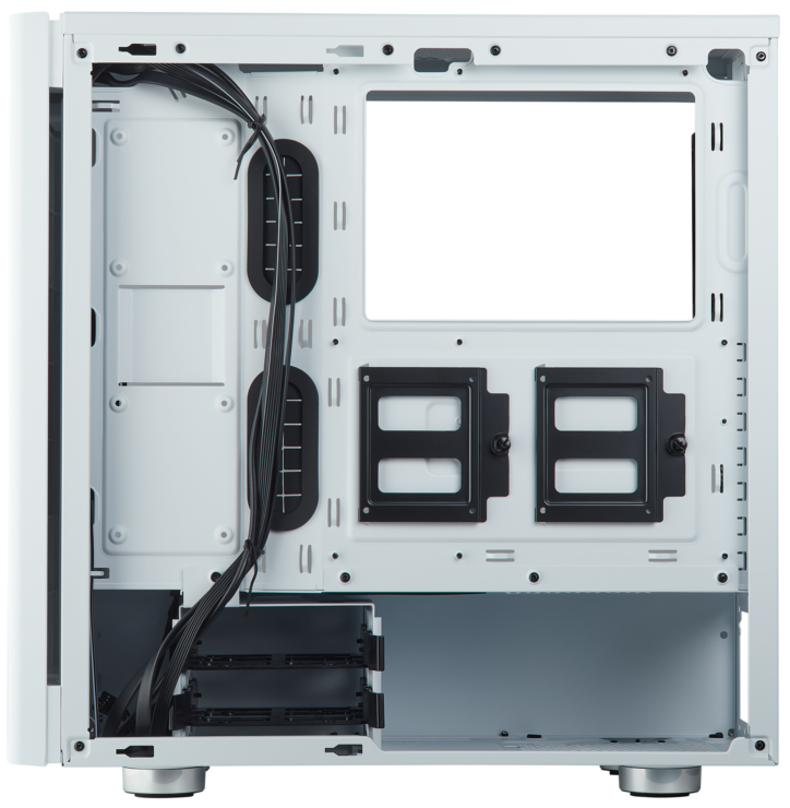 Đi kèm với thùng máy là hai quạt tản nhiệt SP120 của Corsair, cùng hàng loạt khe tản nhiệt để game thủ lắp radiance tản nước, ví dụ như cổng mặt trước đủ diện tích để lắp radiance 360mm, còn ở mặt trên thùng case là khe rãnh hỗ trợ những bộ tản AIO hoặc custom với kích thước lưới tản từ 240 đến 280mm. Giống hệt như Carbide 270R, sườn phải thùng máy là hai điểm gắn ốc vít để cố định ổ cứng SSD và HDD, khe giấu cable nguồn cũng như cáp SATA để làm đẹp thêm cho bộ máy tính chục triệu của game thủ.